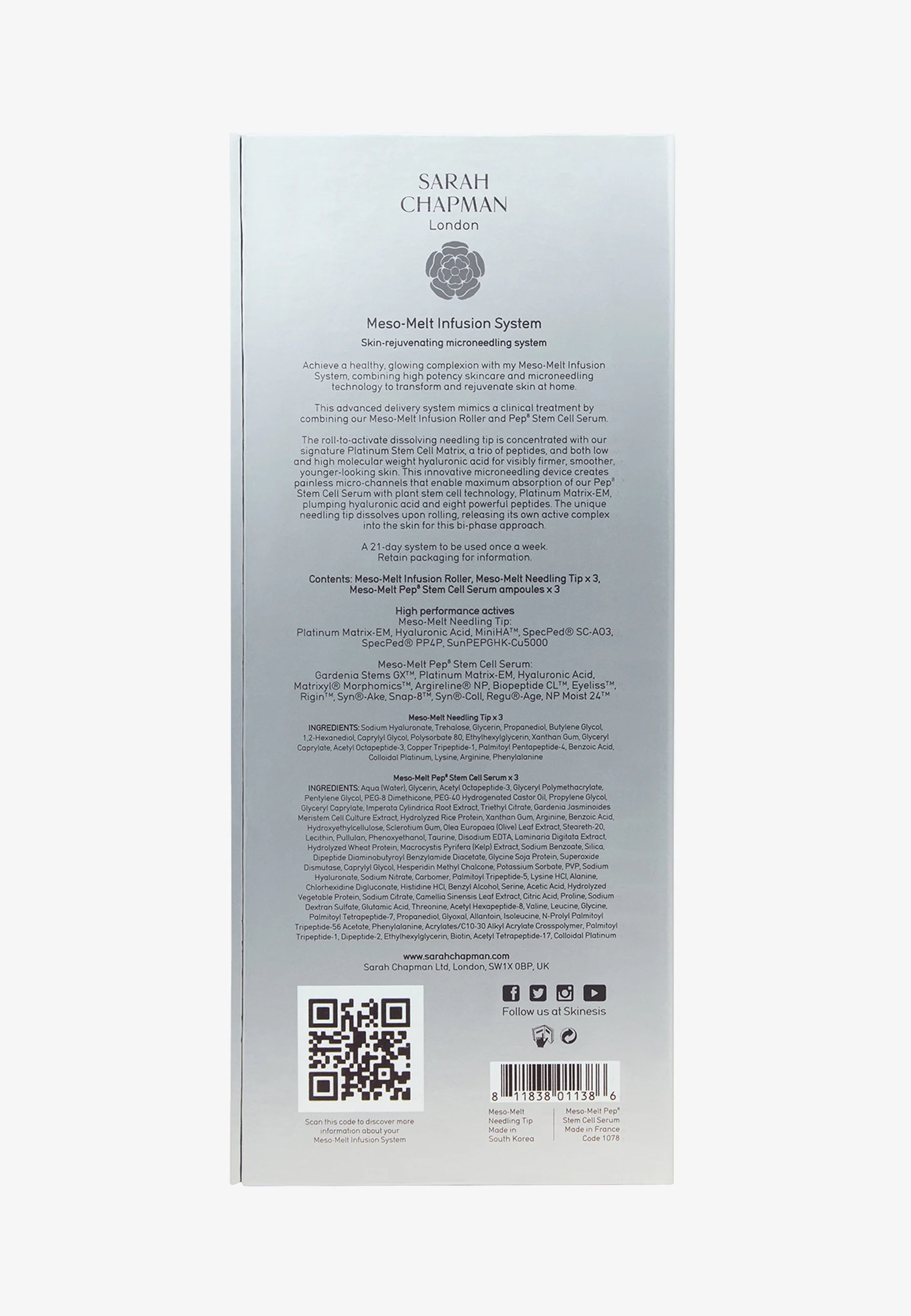 MESO-MELT NEEDLING TIP INGREDIENTS: SODIUM HYALURONATE, TREHALOSE, GLYCERIN, PROPANEDIOL, BUTYLENE GLYCOL, 1,2-HEXANEDIOL, CAPRYLYL GLYCOL, POLYSORBATE 80, ETHYLHEXYLGLYCERIN, XANTHAN GUM, GLYCERYL CAPRYLATE, ACETYL OCTAPEPTIDE-3, COPPER TRIPEPTIDE-1, PALMITOYL PENTAPEPTIDE-4, BENZOIC ACID, COLLOIDAL PLATINUM,LYSINE, ARGININE, PHENYLALANINE MESO-MELT PEP? STEM CELL SERUM X 3 INGREDIENTS: AQUA (WATER), GLYCERIN, ACETYL OCTAPEPTIDE-3, GLYCERYL POLYMETHACRYLATE, PENTYLENE GLYCOL, PEG-8 DIMETHICONE, PEG-40 HYDROGENATED CASTOR OIL, PROPYLENE GLYCOL, GLYCERYL CAPRYLATE, IMPERATA CYLINDRICA ROOT EXTRACT, TRIETHYL CITRATE, GARDENIA JASMINOIDES MERISTEM CELL CULTURE EXTRACT, HYDROLYZED RICE PROTEIN, XANTHAN GUM, ARGININE, BENZOIC ACID, HYDROXYETHYLCELLULOSE, SCLEROTIUM GUM, OLEA EUROPAEA (OLIVE) LEAF EXTRACT, STEARETH-20, LECITHIN, PULLULAN, PHENOXYETHANOL, TAURINE, DISODIUM EDTA, LAMINARIA DIGITATA EXTRACT, HYDROLYZED WHEAT PROTEIN, MACROCYSTIS PYRIFERA (KELP) EXTRACT, SODIUM BENZOATE, SILICA, DIPEPTIDE DIAMINOBUTYROYL BENZYLAMIDE DIACETATE, GLYCINE SOJA PROTEIN, SUPEROXIDE DISMUTASE, CAPRYLYL GLYCOL, HESPERIDIN METHYL CHALCONE, POTASSIUM SORBATE, PVP, SODIUM HYALURONATE, SODIUM NITRATE, CARBOMER, PALMITOYL TRIPEPTIDE-5, LYSINE HCL, ALANINE, CHLORHEXIDINE DIGLUCONATE, HISTIDINE HCL, BENZYL ALCOHOL, SERINE, ACETIC ACID, HYDROLYZED VEGETABLE PROTEIN, SODIUM CITRATE, CAMELLIA SINENSIS LEAF EXTRACT, CITRIC ACID, PROLINE, SODIUM DEXTRAN SULFATE, GLUTAMIC ACID, THREONINE, ACETYL HEXAPEPTIDE-8, VALINE, LEUCINE, GLYCINE, PALMITOYL TETRAPEPTIDE-7, PROPANEDIOL, GLYOXAL, ALLANTOIN, ISOLEUCINE, N-PROLYL PALMITOYL TRIPEPTIDE-56 ACETATE, PHENYLALANINE, ACRYLATES/C10-30 ALKYL ACRYLATE CROSSPOLYMER, PALMITOYL TRIPEPTIDE-1, DIPEPTIDE-2, ETHYLHEXYLGLYCERIN, BIOTIN, ACETYL TETRAPEPTIDE-17, COLLOIDAL PLATINUM