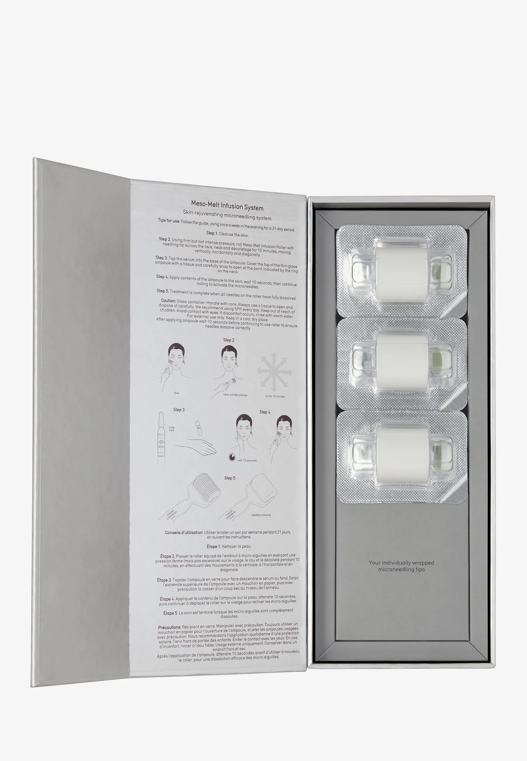 Das Set enthält: Meso-Melt Infusion Roller, Meso-Melt Needling Tip x3, Meso-Melt Pep Stem Cell Serum ampoules x3.