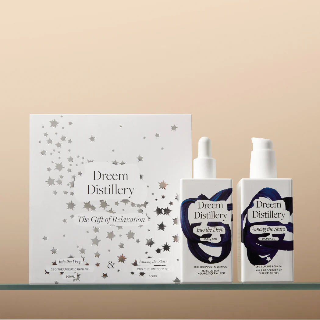 Dieses luxuriöse Duo für das Abendritual kombiniert das Among the Stars Body Oil und das Into the Deep Bath Oil, angereichert mit hochwertigem CBD und wild gesammelten botanischen Extrakten. Die beruhigenden Formulierungen helfen, Anspannungen zu lösen, die Muskeln zu entspannen und den Geist zu beruhigen, während die Haut intensiv gepflegt und genährt wird. So unterstützt das Set den natürlichen Übergang in die nächtliche Ruhe und fördert einen tiefen, erholsamen Schlaf.